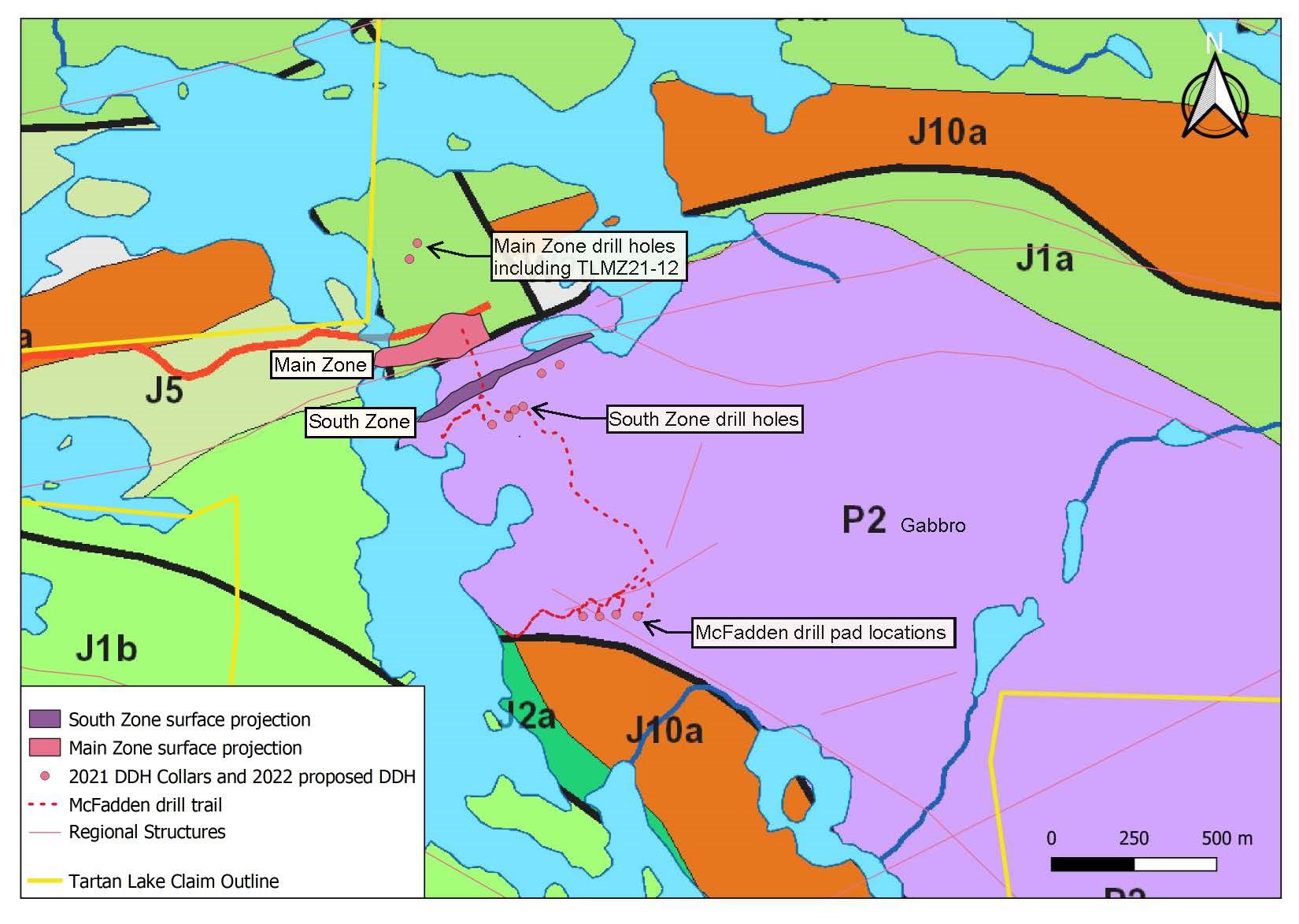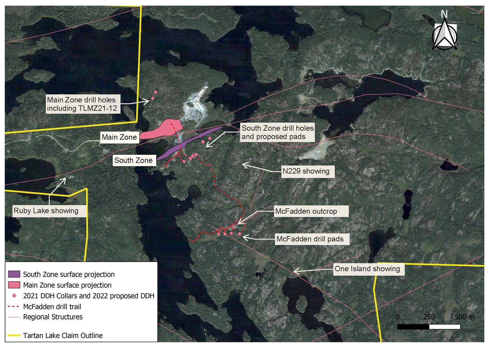 The first 2,000 metres of a 5,000 metre drilling campaign has commenced at the McFadden Zone, a 30 metre by 40 metre stripped shear zone outcrop located 1 kilometre south-east of the known Main Zone deposit. Drilling at McFadden will precede the 3,000+ metre drill program planned to further test the Main Zone, the South Zone, and the interpreted new Hanging Wall Zone, which returned the second highest value intercept ever recorded at Tartan Lake at hole TLMZ21-12, intersecting 47.56 g/t Au averaged over 5.8 meters, within a wider interval averaging 23.76 g/t Au over 12.6 meters (See news release dated December 6, 2021).