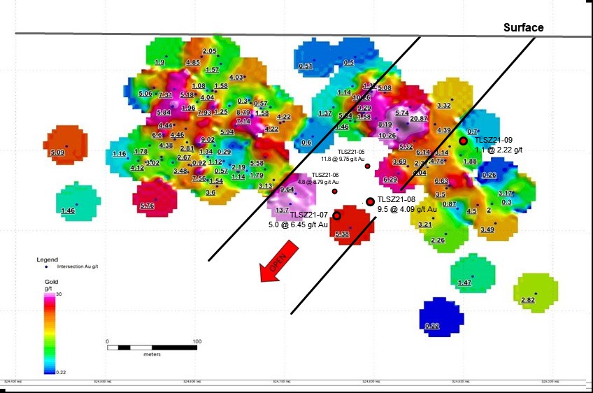 - TLSZ21-08 averaged 8.03 g/t Au over 4.0 metres within a broader interval averaging 4.44 g/t Au over 9.50 metres;