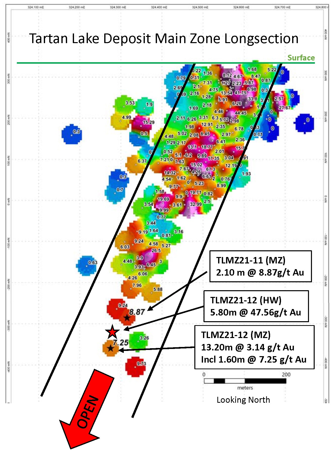 TLMZ21-11 and TLMZ21-12 both targeted the down plunge continuation of the Main Zone mineralization, approximately 100 metres to the west of TLMZ21-01 (4.15 metres averaging 9.73 g/t Au) and 75 and 150 metres below the historic holes defining the resource limits.